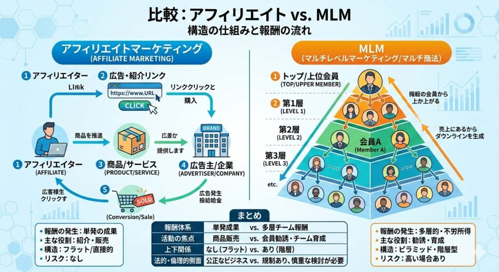 - アフィリエイトとMLMはまったく別物で別の法律により管理されています。