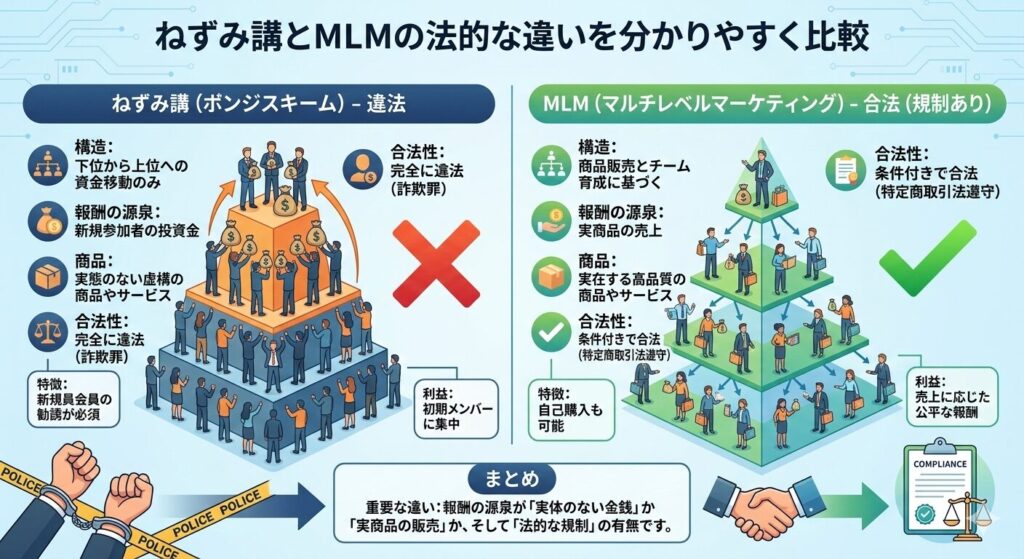 | 法律 | 特定商取引法(規制はあるが合法) | 無限連鎖講防止法(全面禁止・違法) |